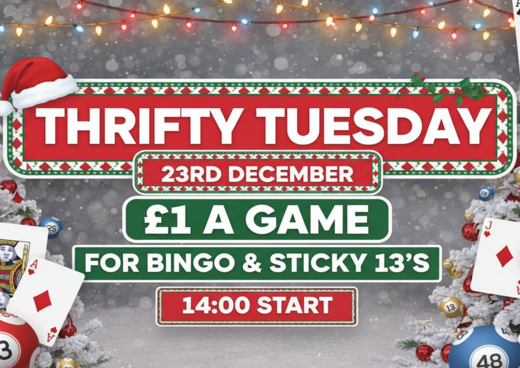 Join us for a festive edition of Thrifty Tuesday, where you can enjoy all your favourite games at unbeatable value! 🎄 £1 a game for Bingo & Sticky 13’s