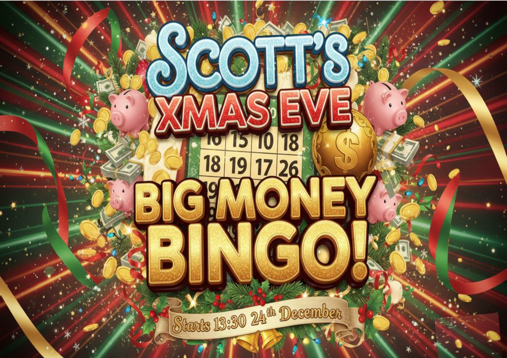 Kick off your Christmas Eve with one of our biggest bingo events of the year! Scott’s Xmas Eve Big Money Bingo is packed with huge prizes, festive fun and that full-on Christmas atmosphere everyone loves.